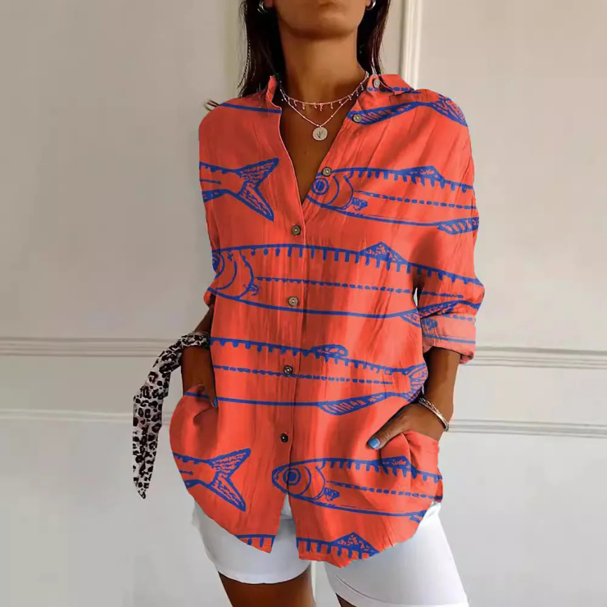 Mit der SANDRA Bluse bringst du frische Farben und moderne Eleganz in deine Garderobe. Der klassische Hemdkragen trifft auf ein lebendiges, farbenfrohes Muster, das sofort ins Auge fällt – perfekt, um deinem Alltagslook das gewisse Etwas zu verleihen. Die langen Ärmel und die lockere Passform machen sie zum idealen Begleiter für viele Gelegenheiten, von Büro bis Freizeit. Der weiche Baumwollstoff sorgt für ein angenehmes Tragegefühl – den ganzen Tag über.